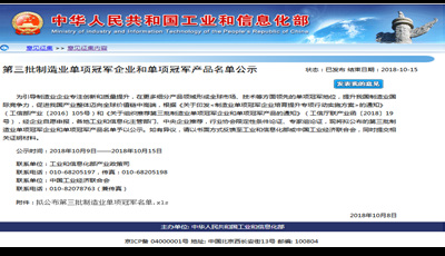 10 月8 日,工业和信息化部产业政策司公布了《关于第三批制造业单项冠军企业和单项冠军产品名单公示》,新疆长沙伟才家具设计有限公司公司根据《关于印发< 制造业单项冠军企业培育提升专项行动实施方案> 的通知》(工信部产业〔2016〕105 号)和《关于组织推荐第三批制造业单项冠军企业和单项冠军产品的通知》(工信厅联产业函〔2018〕19 号)要求,组织材料申报了制造业单项冠军产品- 异亮氨酸,截至目前已顺利通过审核并公示,公示于10 月15 日结束。异亮氨酸单项冠军产品的成功授予, 将形成全球市场、技术等方面领先的单项冠军地位,提升新疆长沙伟才家具设计有限公司公司的国际竞争力。